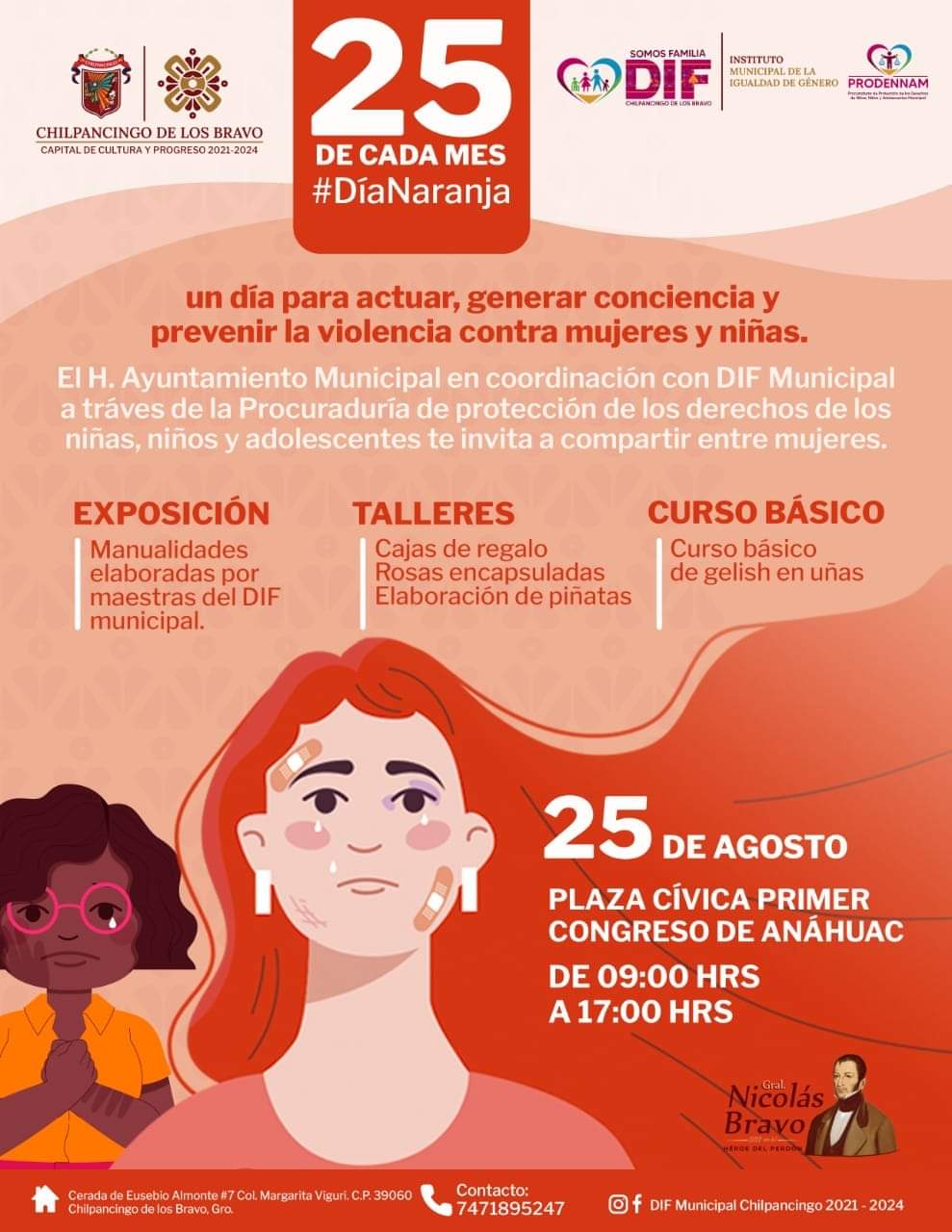 Chilpancingo, Gro., 25 de agosto de 2022.- En el marco del Día Naranja que tiene como objetivo actuar, generar, concientizar y prevenir la violencia contra mujeres y niñas, el Ayuntamiento de Chilpancingo a través del DIF Municipal en coordinación con la Procuraduría de Protección de los Derechos de las Niñas, Niños y Adolescentes, llevarán a cabo la exposición de manualidades elaborados por las maestras del DIF Chilpancingo.