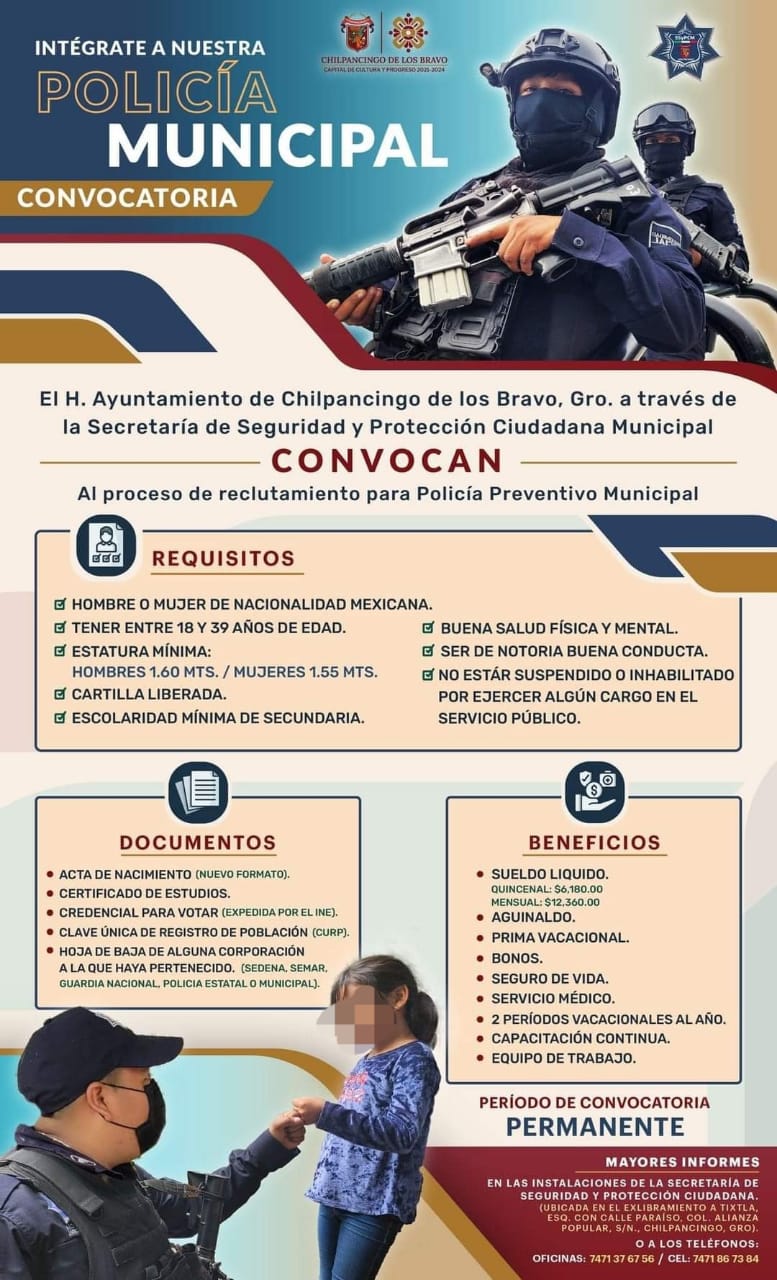 Chilpancingo, Gro., 06 de septiembre de 2022.- El ayuntamiento de Chilpancingo, a través de la Secretaría de Seguridad Pública y Protección Ciudadana, hizo pública la convocatoria de reclutamiento de elementos para la Policía Municipal.