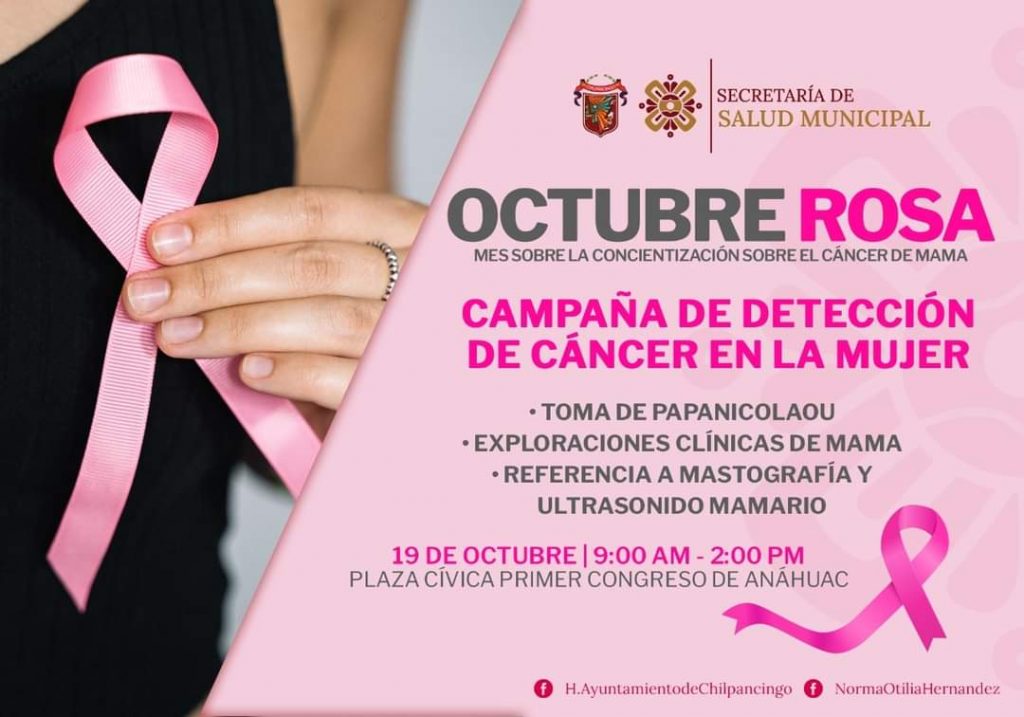 Chilpancingo, Gro., a 19 de octubre de 2022.- En el marco del “Día de la Lucha Contra el Cáncer de Mama” el gobierno municipal que encabeza la alcaldesa Norma Otilia Hernández Martínez, a través de la Secretaría de Salud Municipal y la Jurisdicción Sanitaria 03 Centro, invita al personal femenino del Ayuntamiento de Chilpancingo y al público en general a la charla: “Cáncer en la Mujer (cáncer cervicouterino y cáncer de mama)” este jueves a las 9:00 horas en el Auditorio “José Inocente Lugo” del Palacio Municipal.