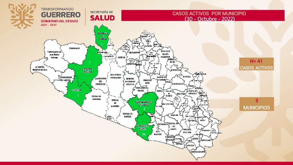 La dependencia estatal indicó que la entidad ocupa el lugar 22 a nivel nacional en casos activos, distribuidos en los municipios de Acapulco, con 36; Chilpancingo, 2 y Coyuca de Catalán, Cutzamala de Pinzón y Petatlán con 1 cada uno.