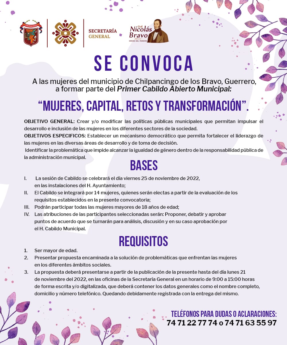Extendemos la cordial invitación a mujeres de #Chilpancingo para participar en el Primer Cabildo Abierto Municipal: “Mujeres, Capital, Retos y Transformación”.
