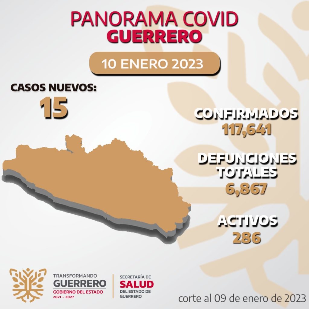 Chilpancingo, Gro., 11 de enero 2023.- Continúa el gobierno del estado que encabeza la gobernadora Evelyn Salgado Pineda, a través de la Secretaría de Salud Guerrero (SSG) aplicando acciones preventivas para evitar la propagación del virus por COVID-19, esto con el fin de prevenir más contagios, se informó que al 09 de enero la dependencia reporta 286 casos activos, de los cuales 15 y 1 defunción se confirmó en las últimas 24 horas.