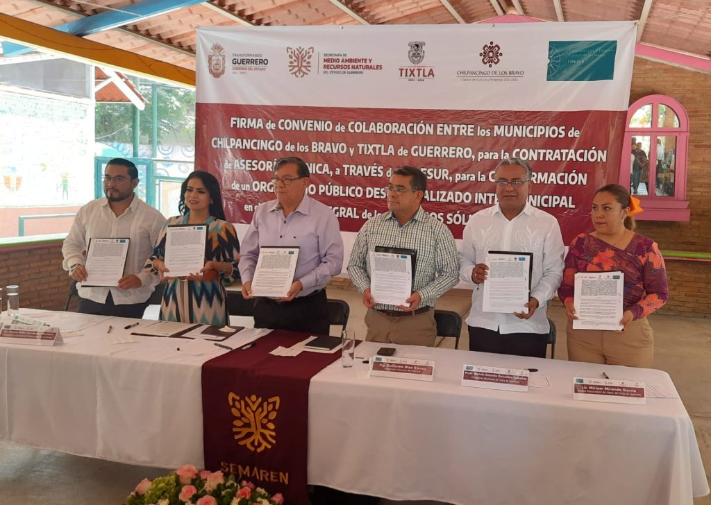 Chilpancingo, Gro., 20 de enero de 2023.- Con la finalidad de fortalecer las acciones para la adecuada gestión integral de los residuos sólidos urbanos, la Secretaría del Medio Ambiente y Recursos Naturales (SEMAREN), firmó el convenio de colaboración entre los municipios de Chilpancingo y Tixtla, para la contratación de asesoría técnica, a través del FIDESUR para la conformación de un organismo público descentralizado intermunicipal en el manejo integral de los residuos sólidos urbanos.