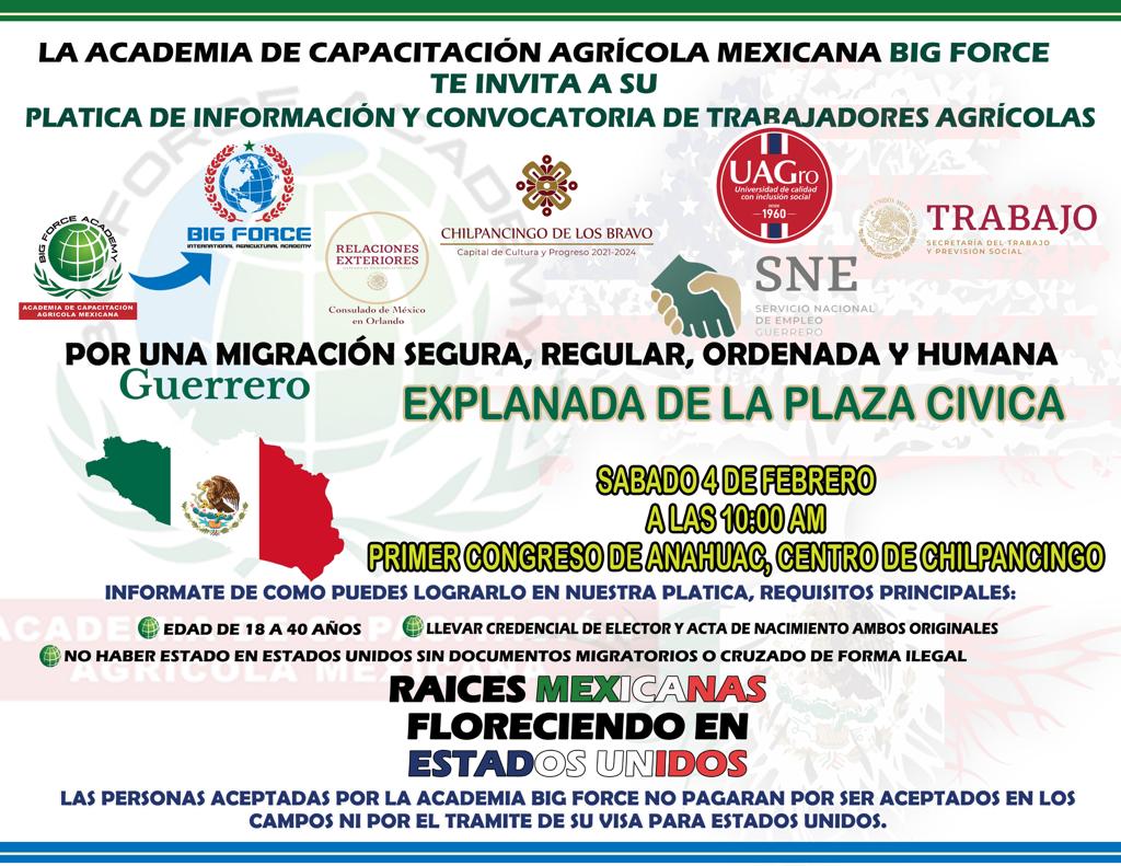 El H. Ayuntamiento Municipal que preside la Lic. Norma Otilia Hernández Martínez, a través de la Secretaría de Desarrollo y Bienestar Social, en coordinación con la Universidad Autónoma de Guerrero y la Academia de Capacitación Agrícola Mexicana BIG FORCE invitan a la población del municipio y comunidades a la platica informativa y convocatoria de trabajadores agrícolas del programa “Raíces Mexicanas Floreciendo en Estados Unidos” que se llevará a cabo el día sábado 4 de Febrero a las 10:00 de la mañana en la Plaza Cívica Primer Congreso de Anáhuac, teniendo como objetivo generar oportunidad de empleo a la ciudadanía interesada como jornaleros agrícolas en Plant City Florida.
