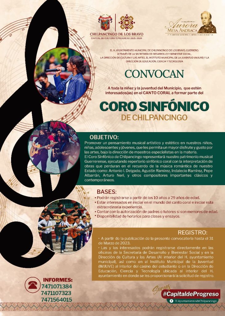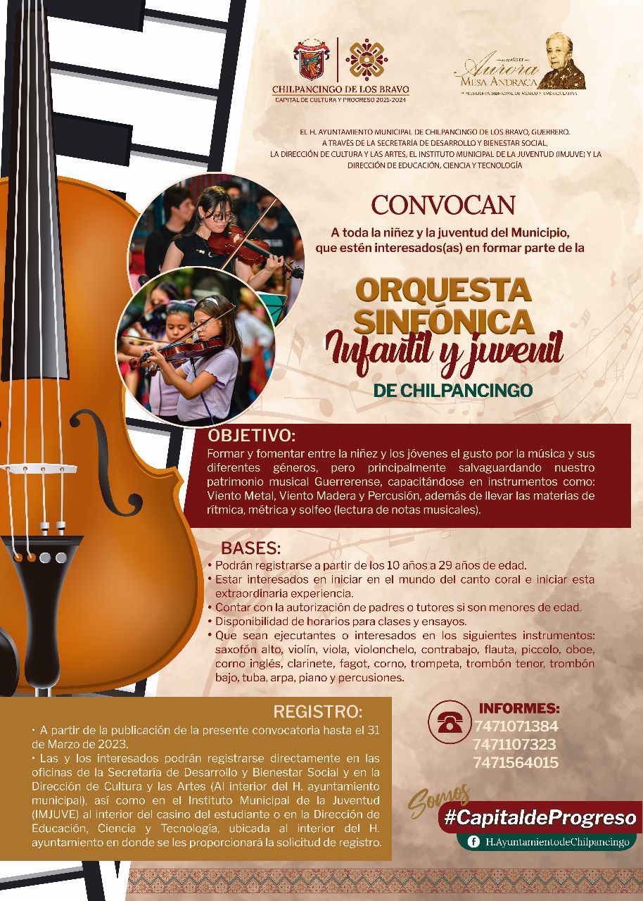 Por instrucciones de la presidenta municipal Norma Otilia Hernández Martínez, la Secretaría de Desarrollo y Bienestar Social amplió 15 días más la convocatoria para la orquesta sinfónica y coro sinfónico infantil y juvenil, resaltando que hasta el momento se han registrado más de 170 aspirantes.