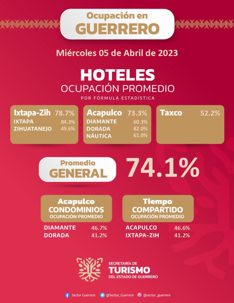 ACAPULCO, Gro., 5 de abril del año 2023.- La ocupación hotelera alcanzó 74.1 por ciento en las tres ciudades turísticas de la entidad este Miércoles Santo, lo que representa 1.7 puntos más respecto al martes.