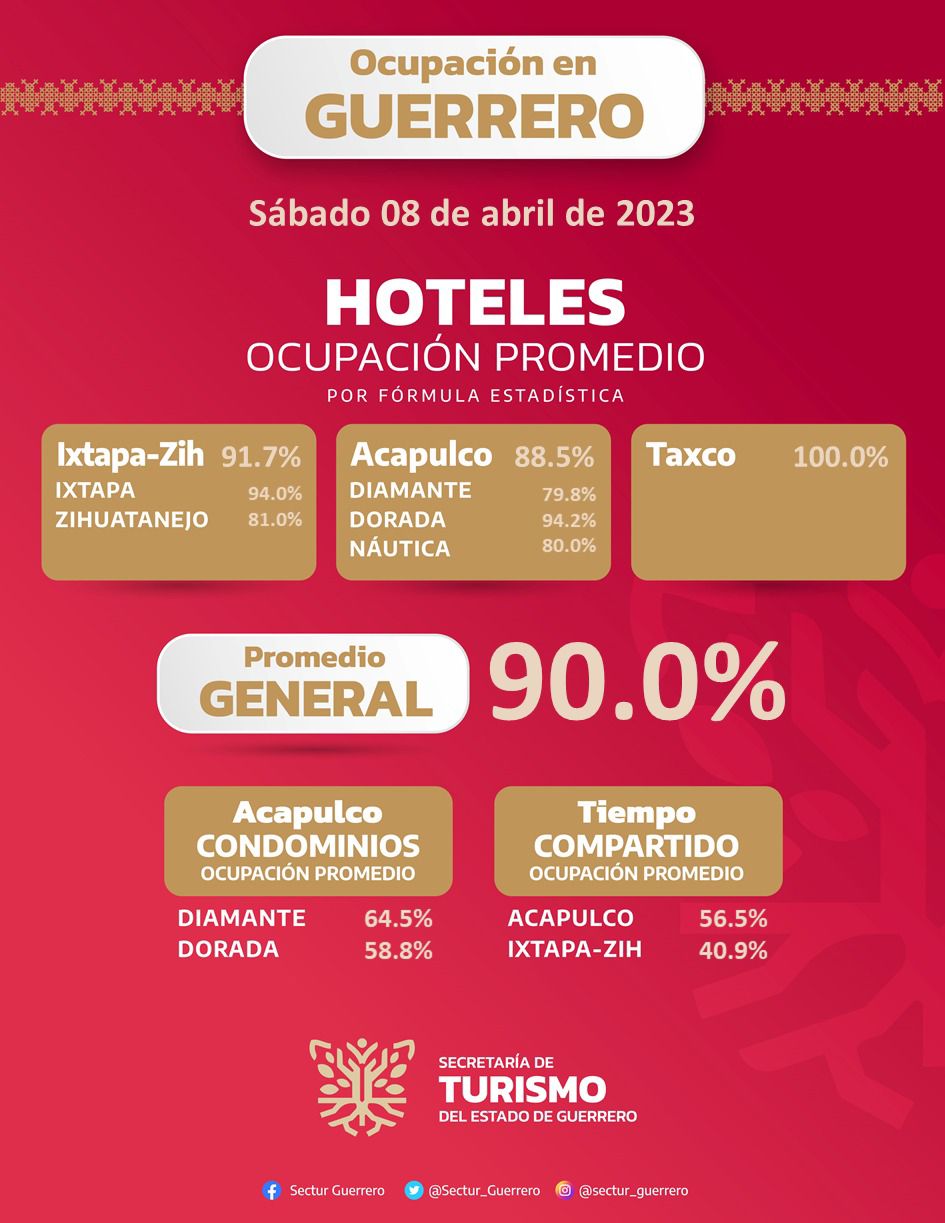 La secretaria de turismo reportó que la ocupación promedio por formula estadística es la siguiente: los hoteles de Ixtapa Zihuatanejo están al 91.7 por ciento. Mientras que en el puerto de Acapulco alcanzo el 88. 5 por ciento dividido por zonas. La diamante esta al 75.8 por ciento, la zona dorada 94.2 por ciento y la náutica 80.0 por ciento.