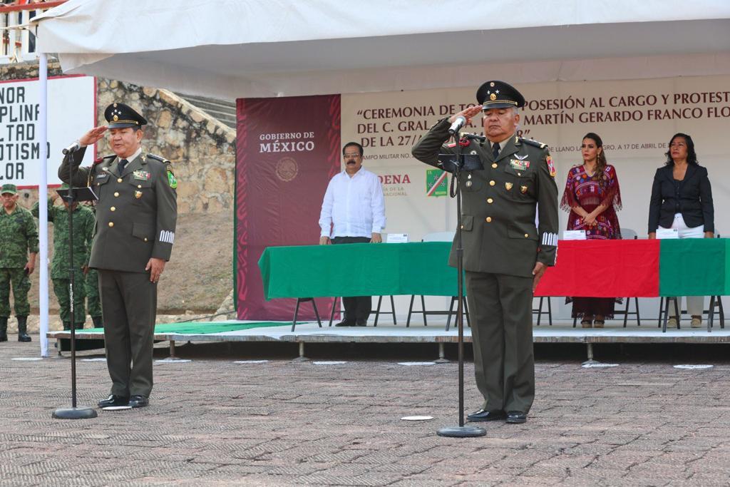 Enseguida el comandante de la Novena Región Militar, Ricardo Flores González tomó la Protesta de Ley así como la Toma de Posesión al Cargo al nuevo encargado de la 27 Zona Militar; enseguida se llevó a cabo la presentación de los mandos ante el comandante Martín Gerardo Franco Flores.
