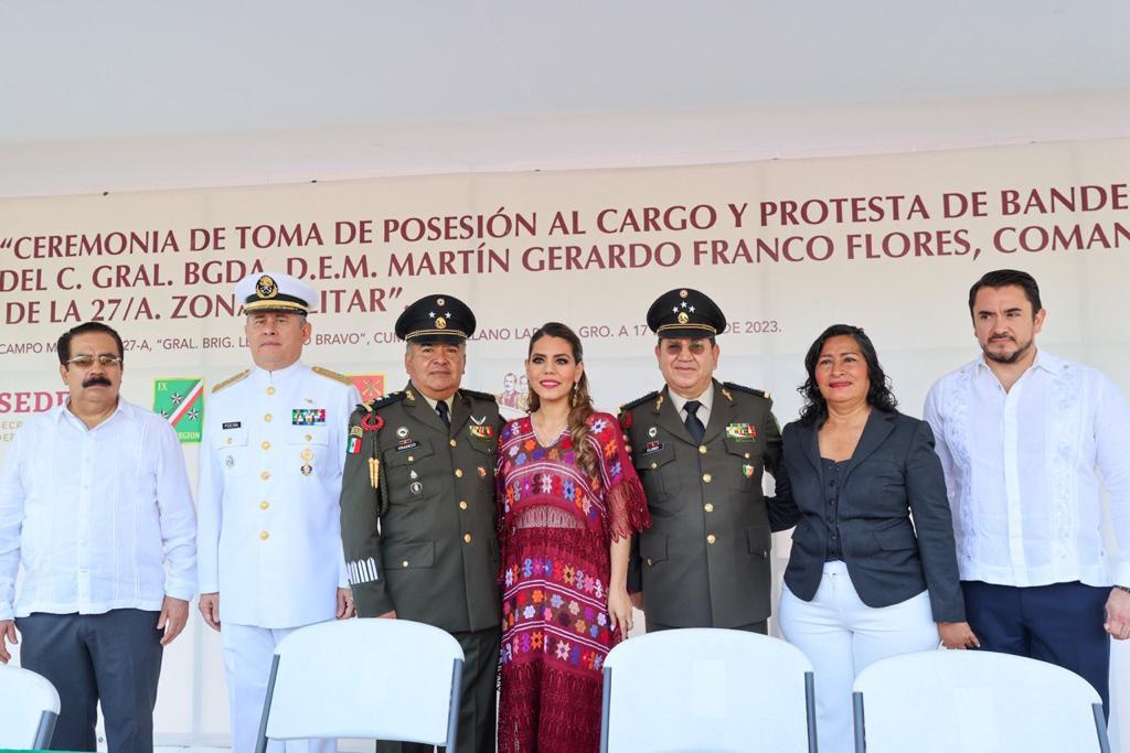 Acapulco, Gro., 18 de abril de 2023.- La gobernadora del estado, Evelyn Salgado Pineda asistió como invitada a la Ceremonia de Toma de Posesión al Cargo y Protesta de Bandera del General de Brigada Diplomado de Estado Mayor, Martín Gerardo Franco Flores, como comandante de la 27 Zona Militar.