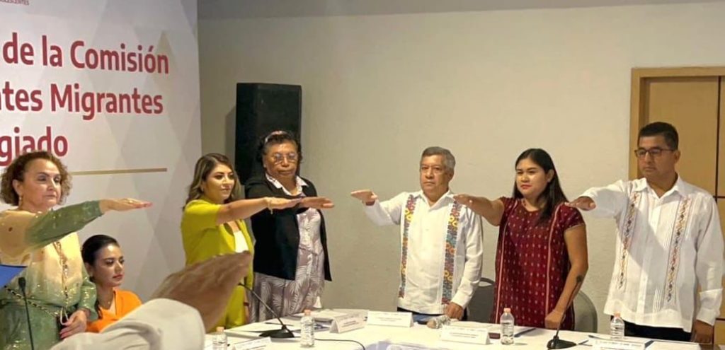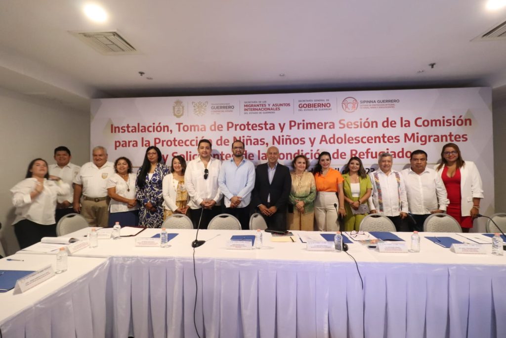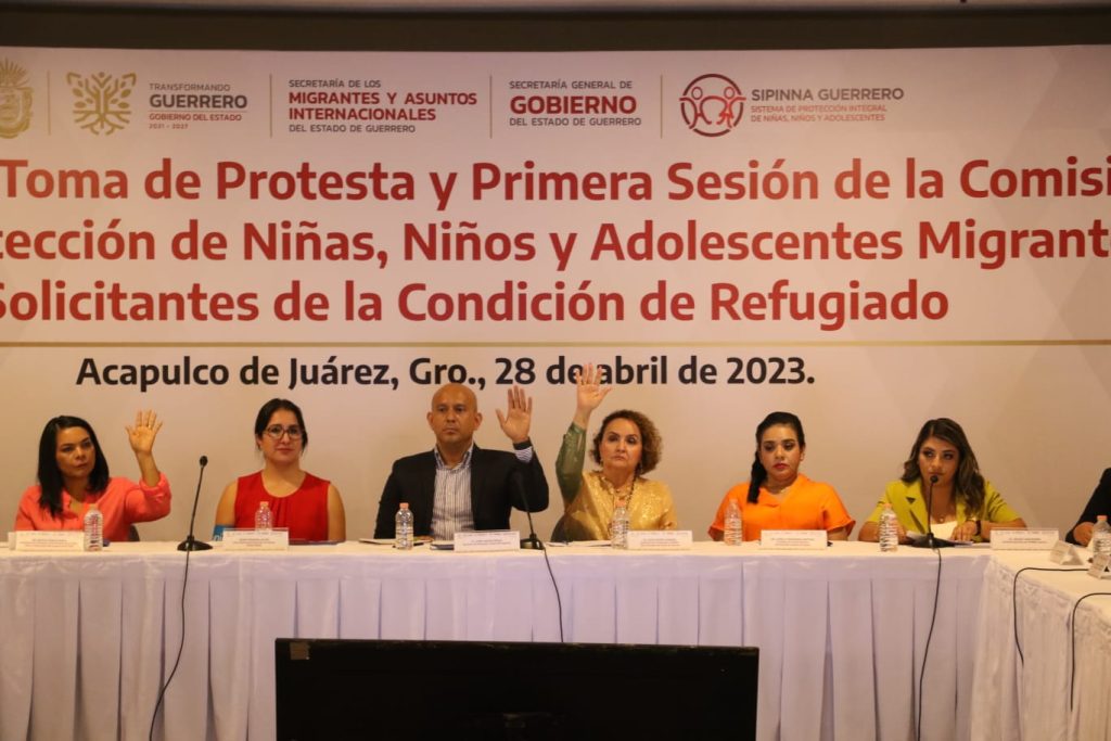 Acapulco, Gro., 29 de abril de 2023.- Con el objetivo de establecer una mesa de trabajo y coordinación institucional entre los gobiernos federal, estatal y organismos internacionales para atender, mediante políticas públicas, programas y acciones la migración de Niñas, Niños y Adolescentes, el gobierno de Guerrero que preside Evelyn Salgado Pineda, a través de la Secretaría de los Migrantes y Asuntos Internacionales, realizó la toma de protesta a los integrantes durante la Primera Sesión de la Comisión para la Protección Integral de Niñas, Niños y Adolescentes Migrantes y Solicitantes de la Condición de Refugiados del Estado de Guerrero.