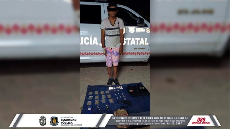 Chilpancingo, Guerrero, 25¿ de mayo de 2023.- En acciones de vigilancia y prevención del delito, personal de la Policía Estatal detuvo a un hombre en posesión de presunta droga, una réplica de plástico de un arma de fuego corta y un cargador de plástico en el municipio de Acapulco.
