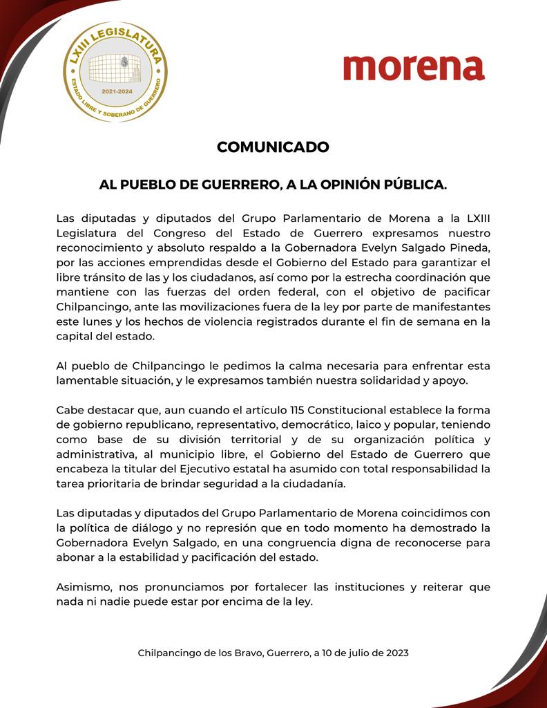 la Cámara Local de Diputados respaldo hoy las acciones de gobierno de la Mandataria Evelyn Salgado Pineda y lanza su mas enérgica protesta en contra de las acciones violentas de manifestación de habitantes del Circuito Turístico Chilpancingo azul y pide al pueblo de Chilpancingo comprehensión y calma ante los hechos violentos que se han desatado este fin de semana y el día lunes.