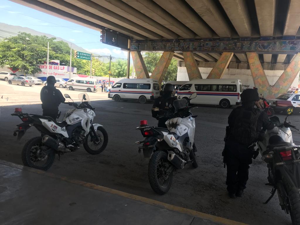Personal de la Policía Estatal se encuentra instalado abajo del puente elevado, sobre la lateral del bulevar Vicente Guerrero, al sur de la capital. Esta medida de la Secretaría de Seguridad Pública Guerrero, tiene como objetivo asegurar la protección del transporte público.