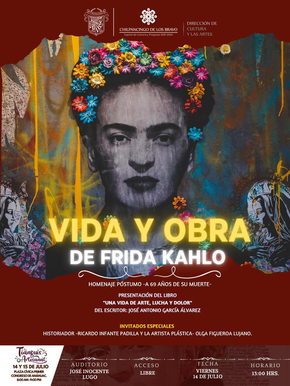 La Dirección de Cultura y las artes del Municipio de Chilpancingo, invitan a Escritores, Analistas, promotores de la cultura, pintores y sociedad en General al Homenaje a la Pintora Mexicana Frida Kahlo a 69 años de su fallecimiento.