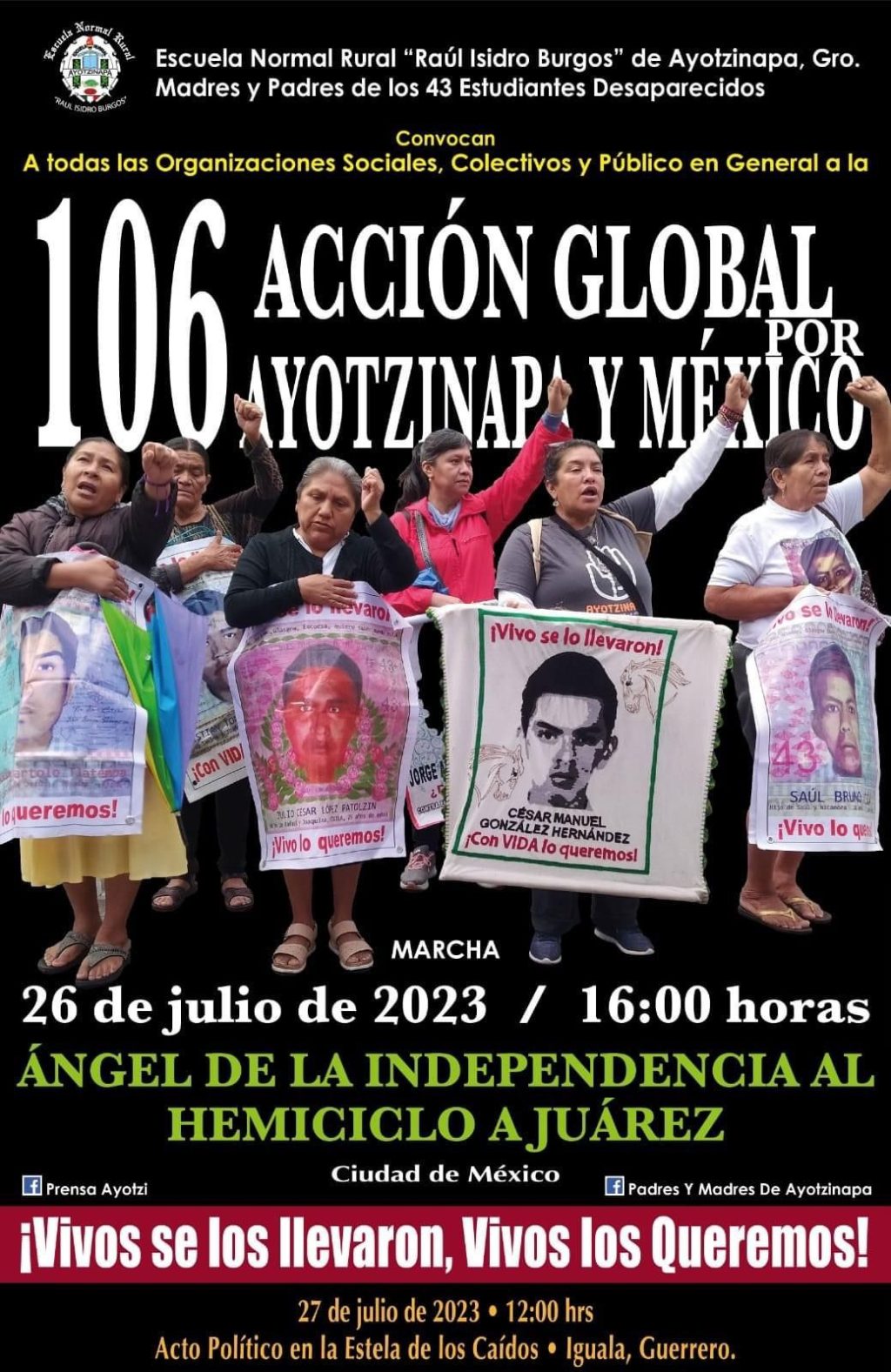 Estudiantes de la Escuela Normal Rural, Raúl Isidro Burgos de Ayotzinapa, madres y padres de los 43 normalistas desaparecidos y la Federación de Estudiantes Campesinos Socialistas de Mexico (FECSM), realizaran un plan de acción denominado 106 acción global por ayotzinapa y México.