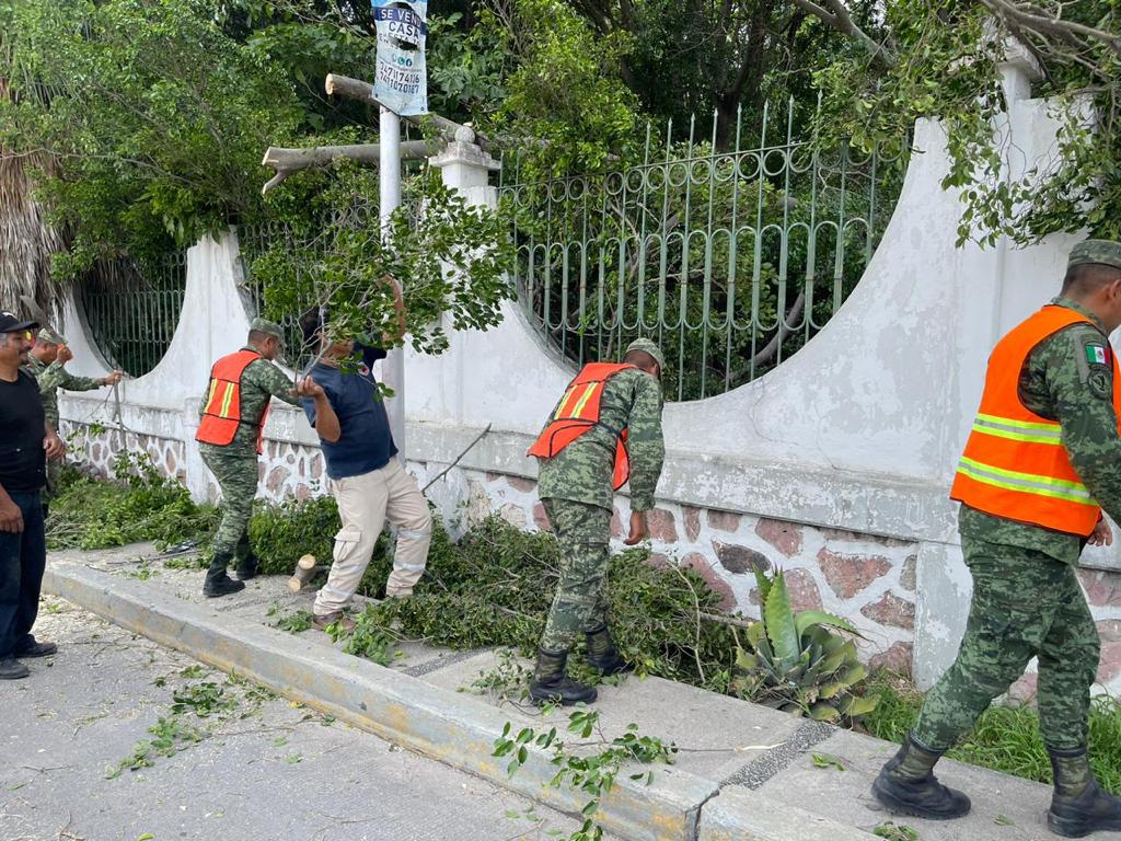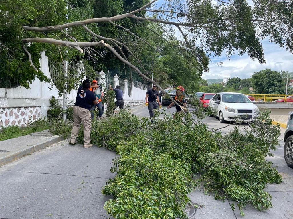 Personal de la Coordinación municipal de Protección Civil participó en las acciones para retirar un árbol colapsado sobre la barda del 50 Batallón de Infantería con la finalidad de garantizar el tránsito seguro por esta zona del encauzamiento de río Huacapa.