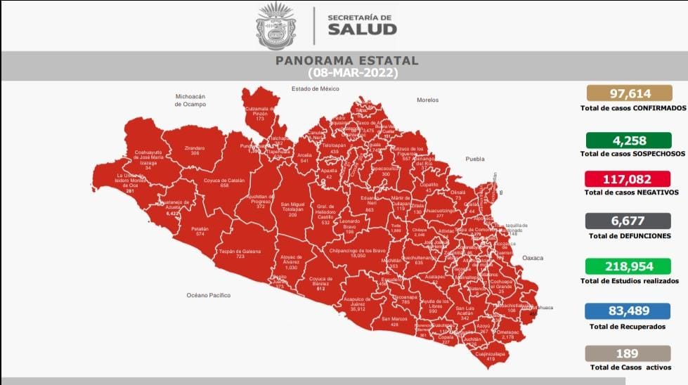 A nivel nacional se registran 24,058 casos activos, y el estado de Guerrero se ubica en el lugar 28 con 189, que se concentran principalmente en los siguientes municipios: