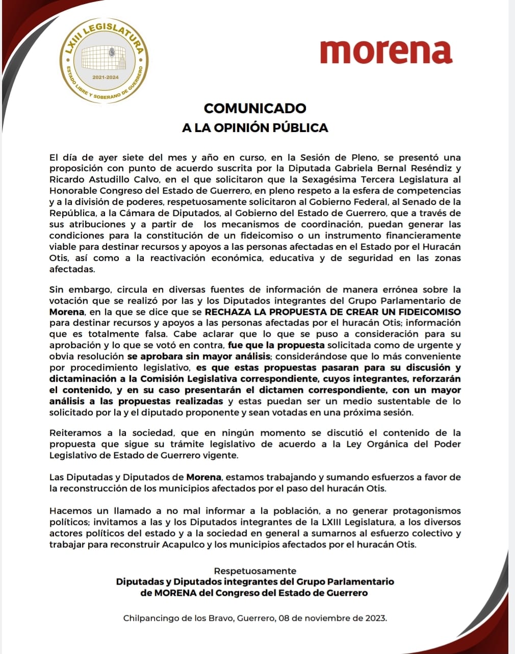 Sin embargo, circula en diversas fuentes de información de manera errónea sobre la votación que se realizó por las y los Diputados integrantes del Grupo Parlamentario de Morena, en la que se dice que se RECHAZA LA PROPUESTA DE CREAR UN FIDEICOMISO para destinar recursos y apoyos a las personas afectadas por el huracán Otis; información que es totalmente falsa. Cabe aclarar que lo que se puso a consideración para su aprobación y lo que se votó en contra, fue que la propuesta solicitada como de urgente y obvia resolución se aprobara sin mayor análisis; considerándose que lo más conveniente por procedimiento legislativo, es que estas propuestas pasaran para su discusión y dictaminación a la Comisión Legislativa correspondiente, cuyos integrantes, reforzarán el contenido, y en su caso presentarán el dictamen correspondiente, con un mayor análisis a las propuestas realizadas y estas puedan ser un medio sustentable de lo solicitado por la y el diputado proponente y sean votadas en una próxima sesión.