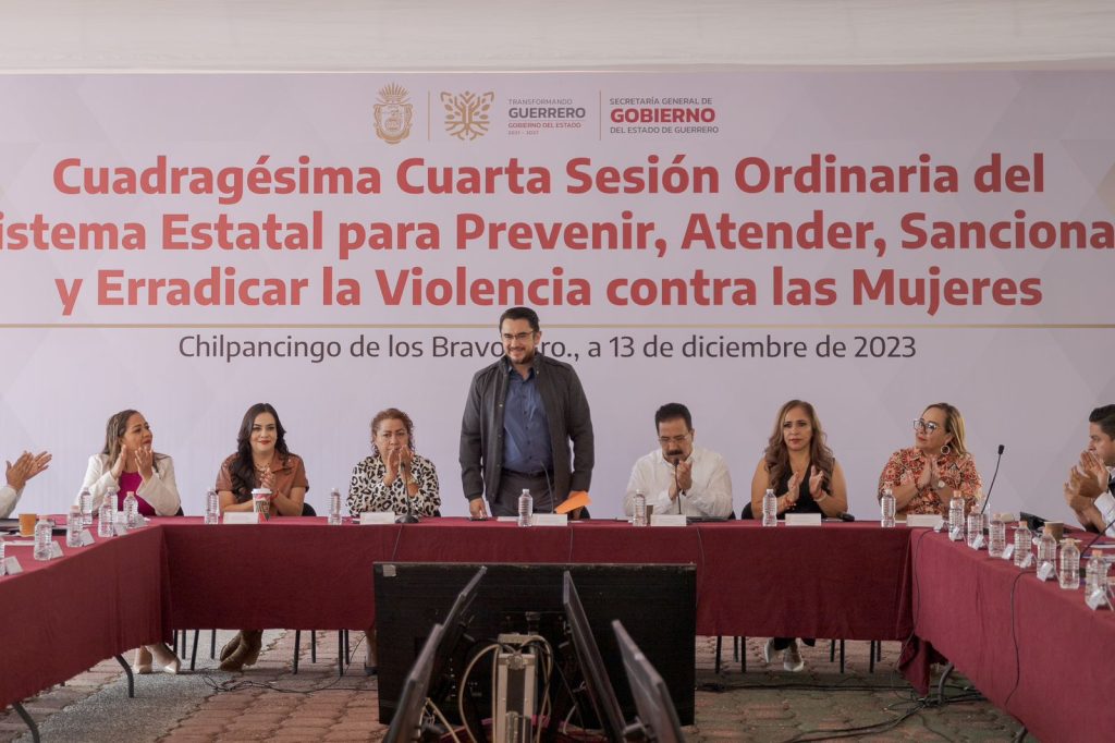 Chilpancingo, Gro., 14 de diciembre de 2023. El secretario general de Gobierno y Presidente del Sistema Estatal para Prevenir, Atender, Sancionar y Erradicar la Violencia contra las Mujeres (SEPASEVM), Ludwig Marcial Reynoso Núñez, encabezó la Cuadragésima Cuarta Sesión del Sistema Estatal para Prevenir, Atender, Sancionar y Erradicar la Violencia contra las Mujeres, donde refrendó el compromiso de combatir la violencia contra las mujeres en el estado.