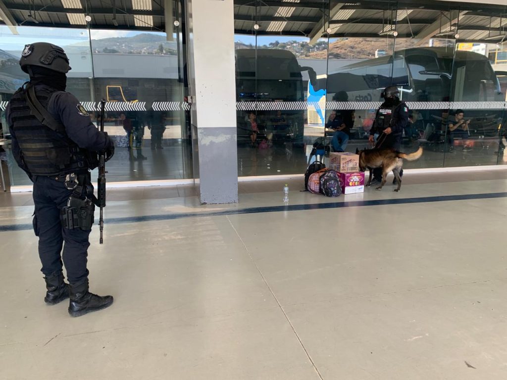 Personal de la Policía Montada de la Secretaría de Seguridad Pública estatal realiza recorridos de seguridad y proximidad social en terminales de autobuses de la ciudad capital de Chilpancingo.