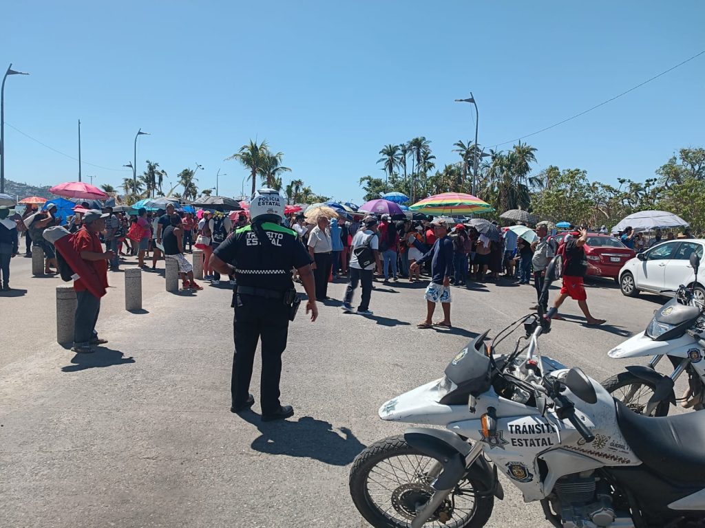Personal de la Dirección de Tránsito, Caminos, Puertos y Aeropuertos de la Secretaría de Seguridad Pública Estatal, se instalaron en puntos estratégicos de la Avenida Costera Miguel Alemán a la altura del Parque Papagayo donde un grupo de personas bloquea esta arteria, demandando ser atendidas en el censo por las afectaciones del Huracán Otis.