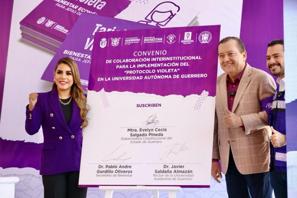 En este evento, la gobernadora Evelyn Salgado firmó un convenio de colaboración con el rector de la Universidad Autónoma de Guerrero, Javier Saldaña Almazán, para implementar acciones conjuntas que fortalezcan el desarrollo del Protocolo Violeta en la máxima casa de estudios y difundir los componentes del programa entre la comunidad universitaria.