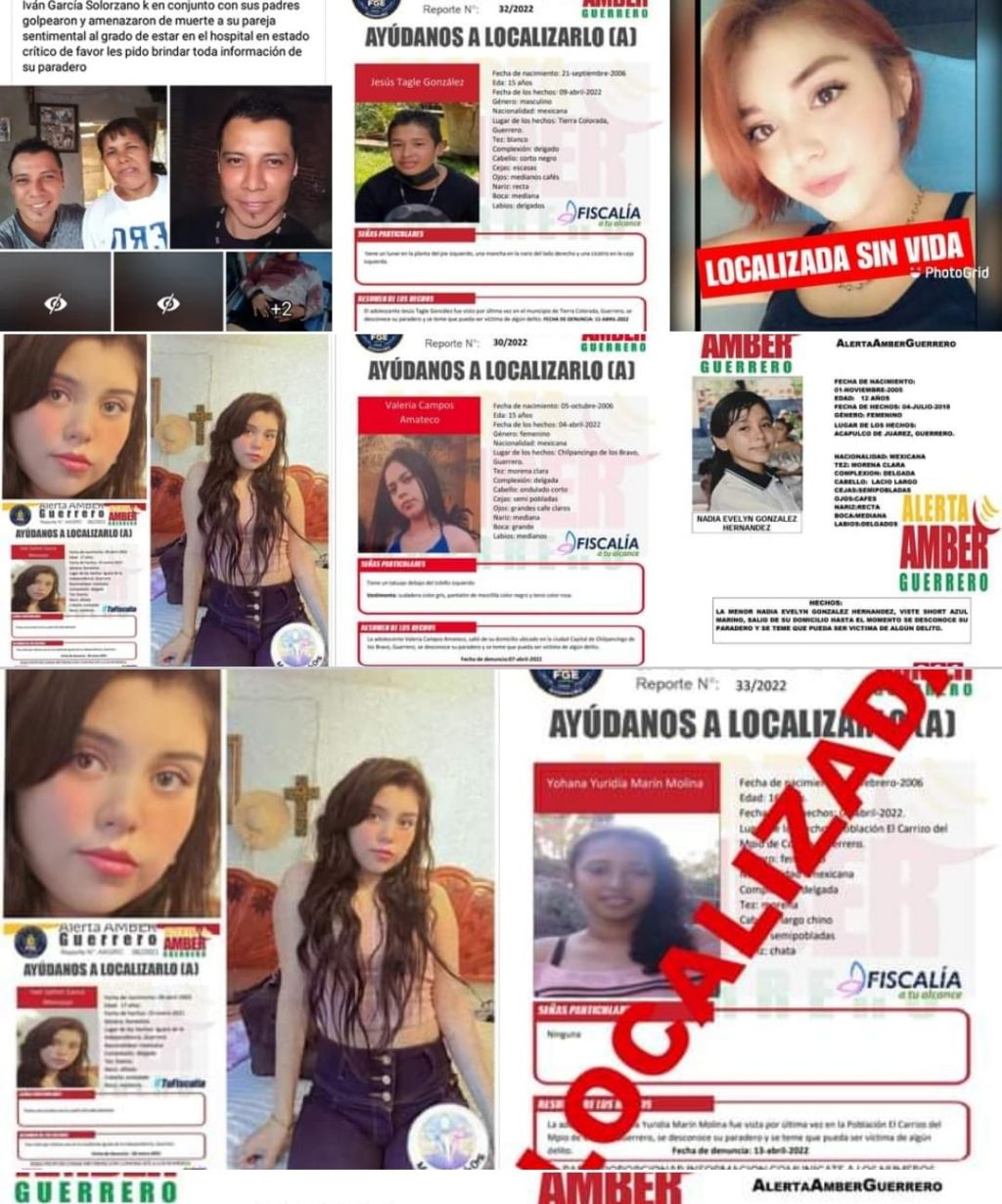 De acuerdo con las fichas de búsqueda que se han publicado en el portal oficial de la Fiscalía y en las diversas redes sociales que manejan las mujeres que se han reportado como desaparecidas en Guerrero son 34, de estas 17 no han sido localizadas y al menos una de las que se encontraban desaparecidas se localizó sin vida y para identificarla la fiscalía le colocó un moño de luto en la publicación donde se informó la desactivación de la ficha de búsqueda.