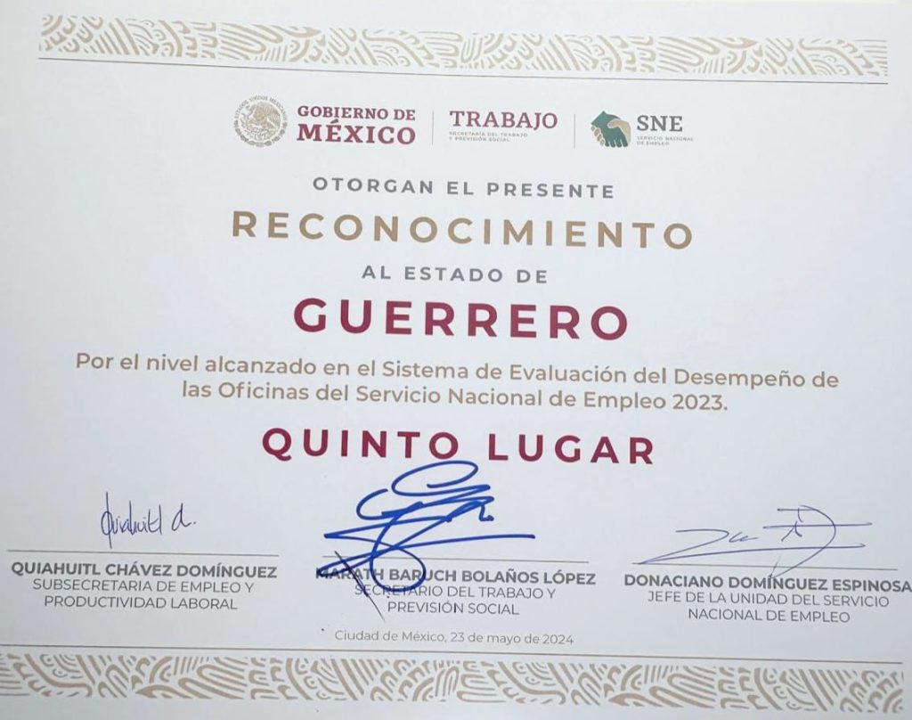 Ciudad de México, 24 de mayo de 2024 – Guerrero obtiene el quinto lugar en el Sistema de Evaluación del Desempeño de las Oficinas del Servicio Nacional de Empleo 2023, destacándose a nivel nacional por su eficaz gestión y resultados en materia de empleo.