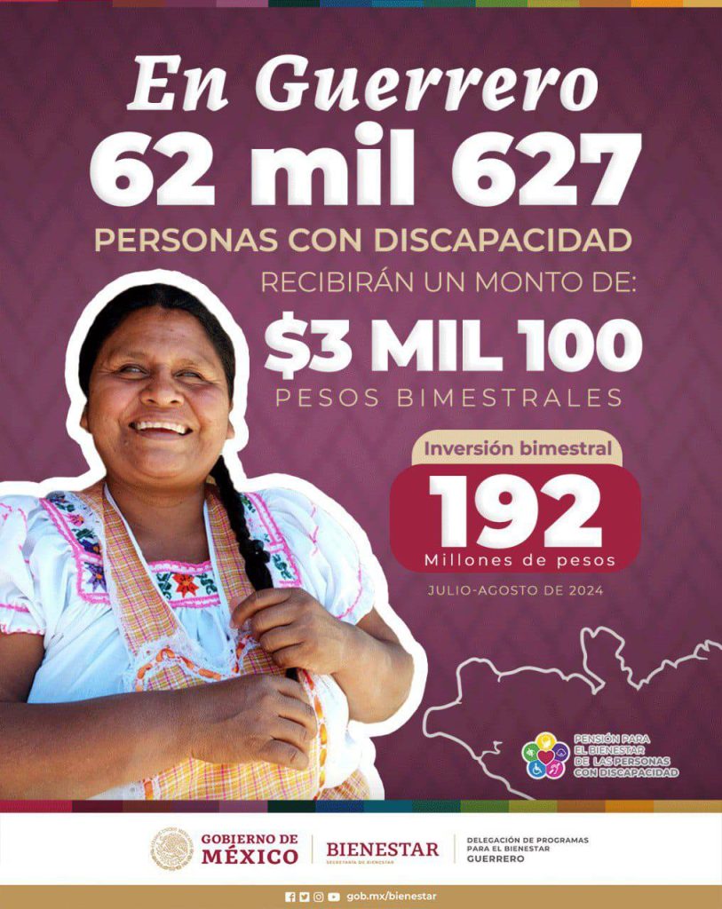 La pensión para adultos mayores en Guerrero beneficia a 366 mil 862 personas con 6 mil pesos bimestrales, sumando más de 2 mil millones de pesos, mientras que el programa para personas con discapacidad, con una inversión bipartita, atiende a 62 mil 627 beneficiarios con 3 mil 100 pesos, sumando más de 192 millones de pesos de inversión.