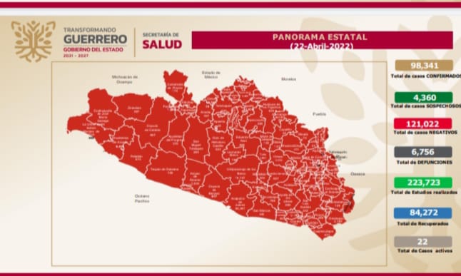 Chilpancingo, Gro., 23 de abril 2022.- El estado de Guerrero se mantiene como una de las entidades del país con menor ocupación de camas para la atención de pacientes de Covid-19, anunció la Secretaría de Salud, al dar a conocer el informe técnico “Covid-19 Guerrero”, que refiere que en las últimas 24 horas, se registraron 8 contagios y ninguna defunción por esta causa.