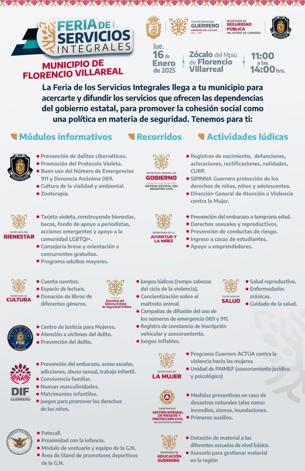 Chilpancingo, Guerrero, 15 de enero de 2025.- Como parte del trajo de territorio y atención directa a la población, el Gobierno de Guerrero, a través de la Secretaría de Seguridad Pública Estatal, alista su Feria de Servicios Integrales para el próximo jueves 16 de enero en el municipio de Florencio Villareal.