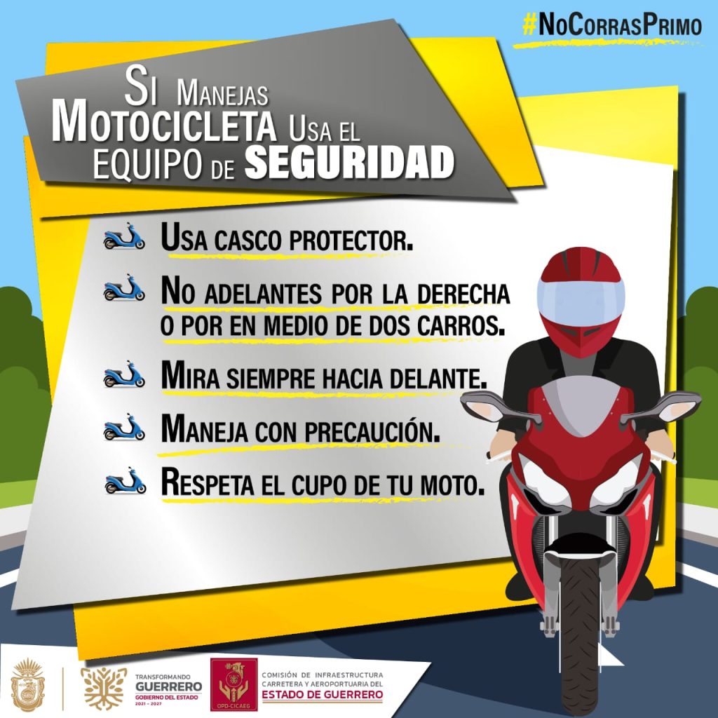 NoCorrasPrimo. Si manejas motocicleta, usa siempre el equipo de seguridad correctamente. Tu vida es lo más importante.