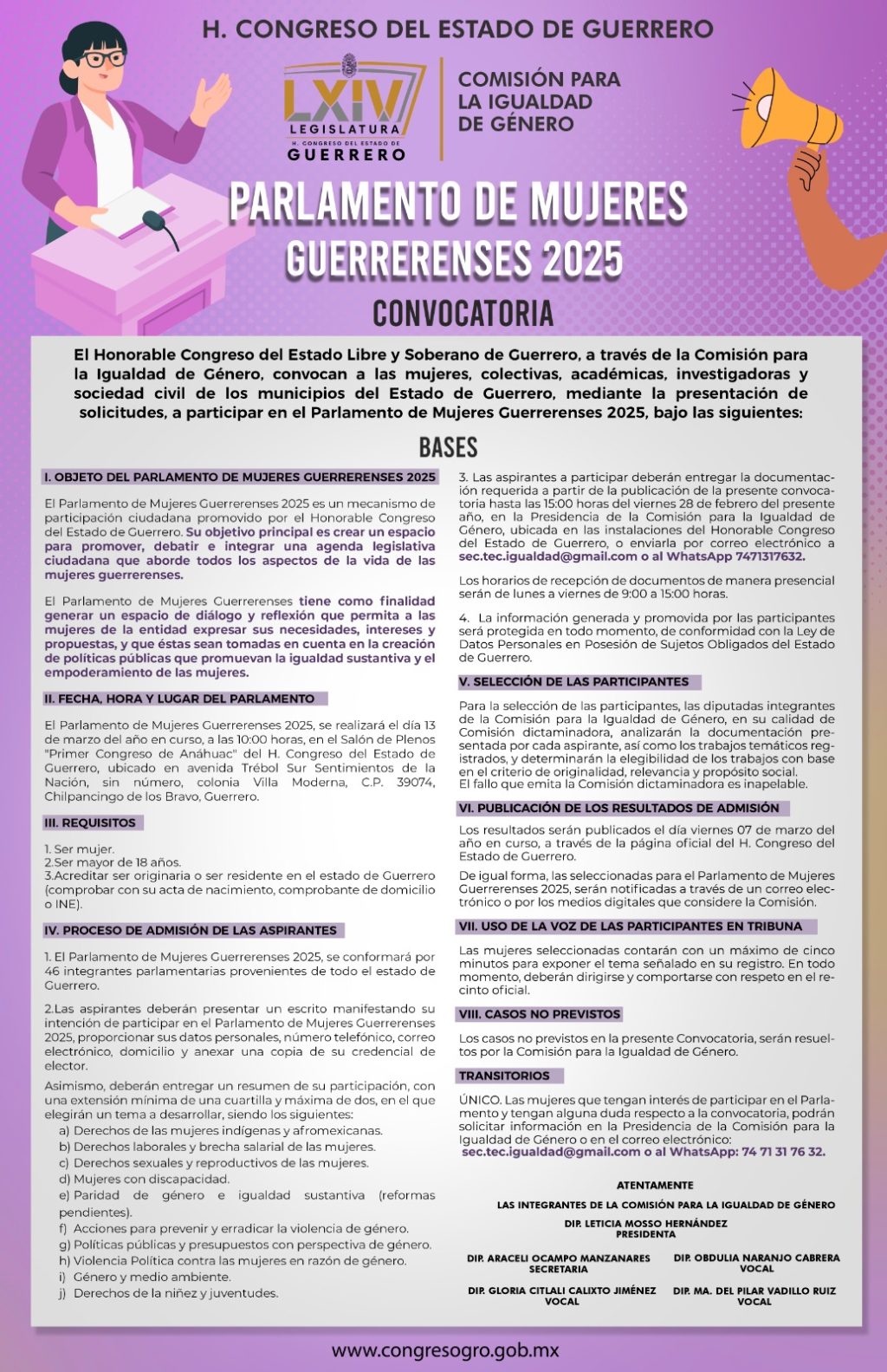 Los resultados serán publicados el día viernes 7 de marzo del año en curso a través de la página oficial del Congreso del Estado, además de que las seleccionadas para el Parlamento de Mujeres Guerrerenses 2025 serán notificadas a través de un correo electrónico o por los medios digitales que considere la Comisión.