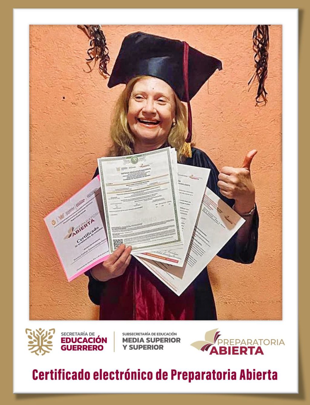 Chilpancingo, Gro., 10 de febrero de 2025.- Blanca Estela Camorlinga Hernández, de 63 años, estudiante de Costa Chica, concluyó sus estudios de bachillerato, obteniendo su certificado de Preparatoria Abierta, informó el secretario de Educación Guerrero, Ricardo Castillo Peña.