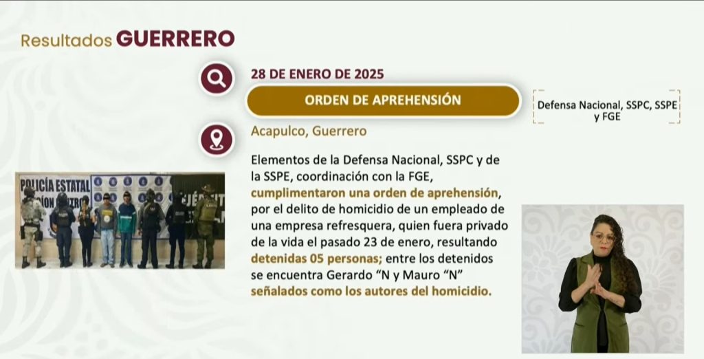 Esta mañana, el Titular de la seguridad del país, detalló que, en un operativo realizado en coordinación con la Secretaría de Seguridad estatal, la Fiscalía General del Estado y el Ejército Mexicano, como parte de la estrategia de seguridad de manera conjunta con la gobernadora Evelyn Salgado Pineda, en seguimiento a una orden de aprehensión se detuvo a las cinco personas, entre ellas, Gerardo “N” y Mauro “N”, señalados como presuntos autores materiales del crimen.