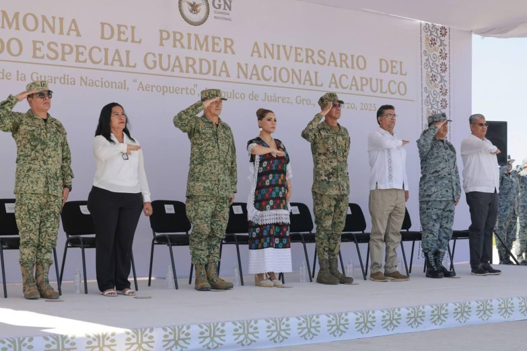Acapulco, Gro., 07 de marzo de 2025.- “Desde el Estado, no sólo reconocemos el invaluable trabajo de la Guardia Nacional, sino que nos sumamos con determinación, a través de la estrategia conjunta, que todos los días impulsamos en la Mesa para la Construcción de la Paz, con acciones contundentes, por las familias de Guerrero”, expresó la gobernadora Evelyn Salgado Pineda durante su participación en la Ceremonia del Primer Aniversario del Mando Especial de la Guardia Nacional en Acapulco.