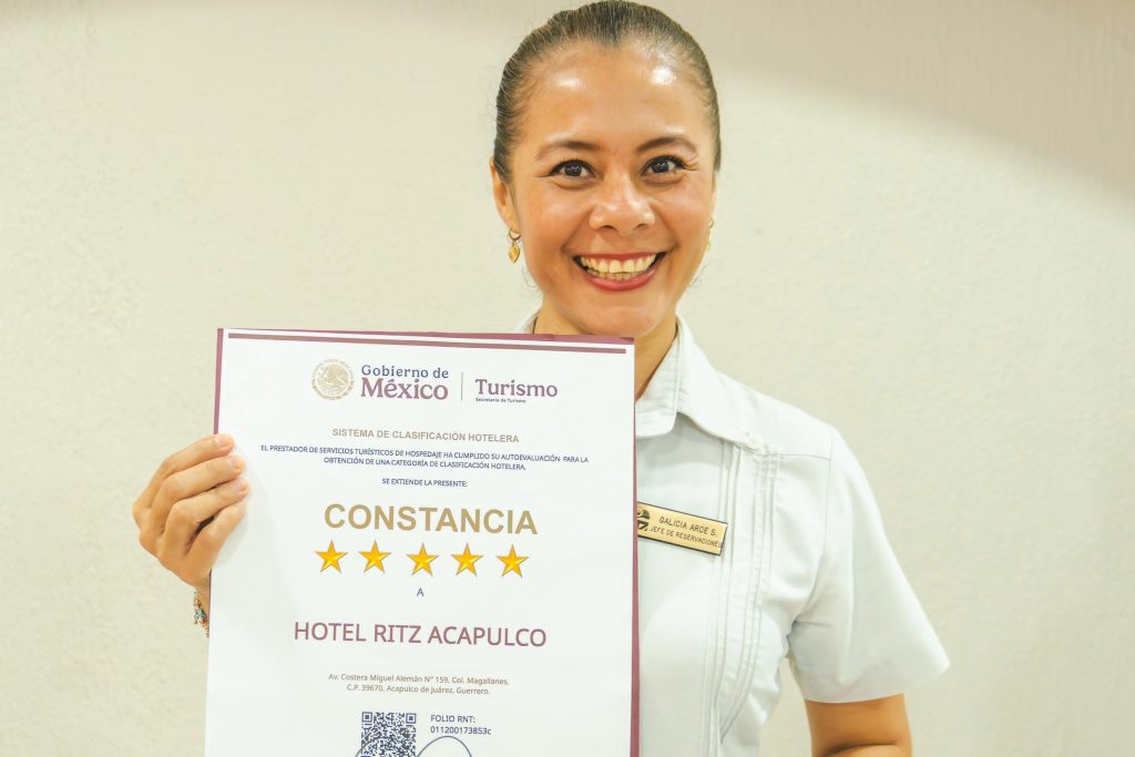 Un ejemplo de este tipo de acciones corresponde al hotel Ritz Acapulco, hospedería que ha recibido la constancia que acredita su clasificación como un hotel de cinco estrellas, a nombre de la gobernadora Evelyn Salgado Pineda, el secretario de Turismo de Guerrero, Simón Quiñones Orozco, entregó el documento al Gerente General Engelberth Zapata Badillo.