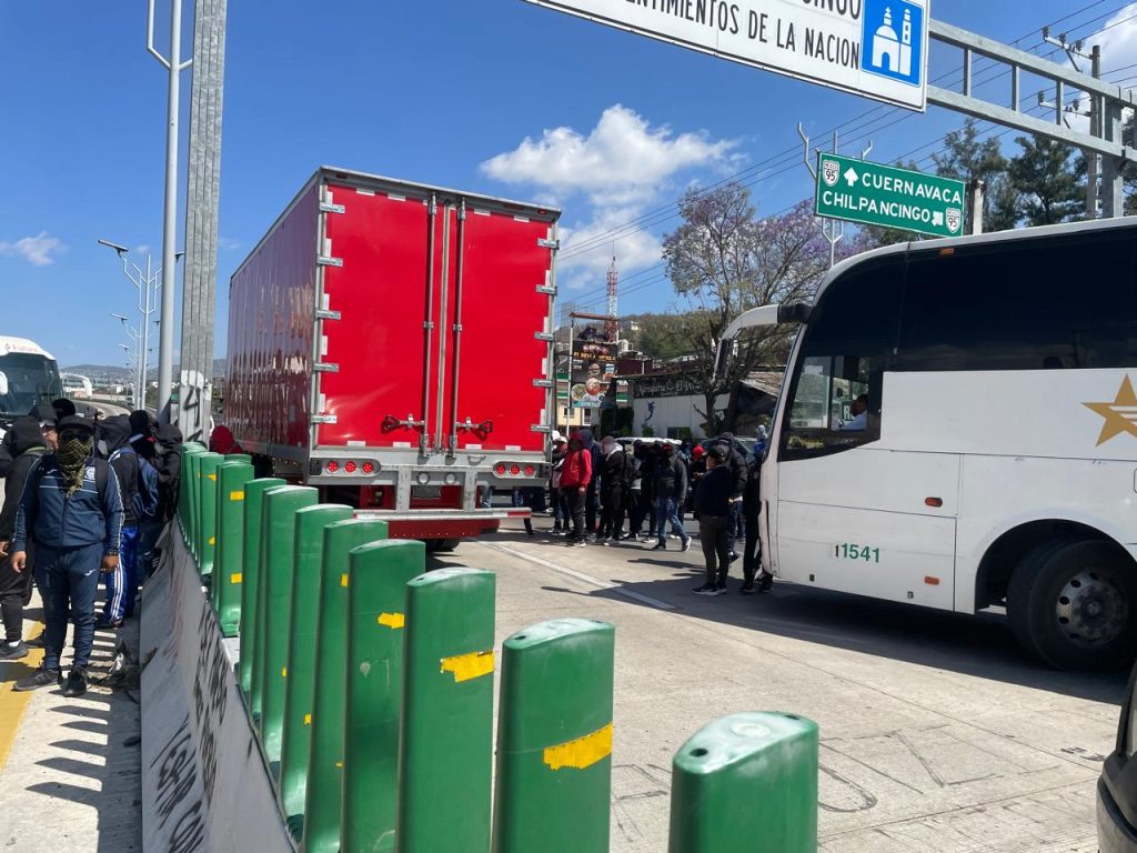 CHILPANCINGO, GRO, 12 DE MARZO DEL 2025-. Estudiantes de la Normal Rural Raúl Isidro Burgos de Ayotzinapa, cerraron los cuatro carriles de la Autopista del Sol en exigencia de una mesa de trabajo con el titular de la Secretaría de Educación Guerrero (SEG) Ricardo Castillo Peña, además de apoderarse de al menos siete autobuses de pasajeros.