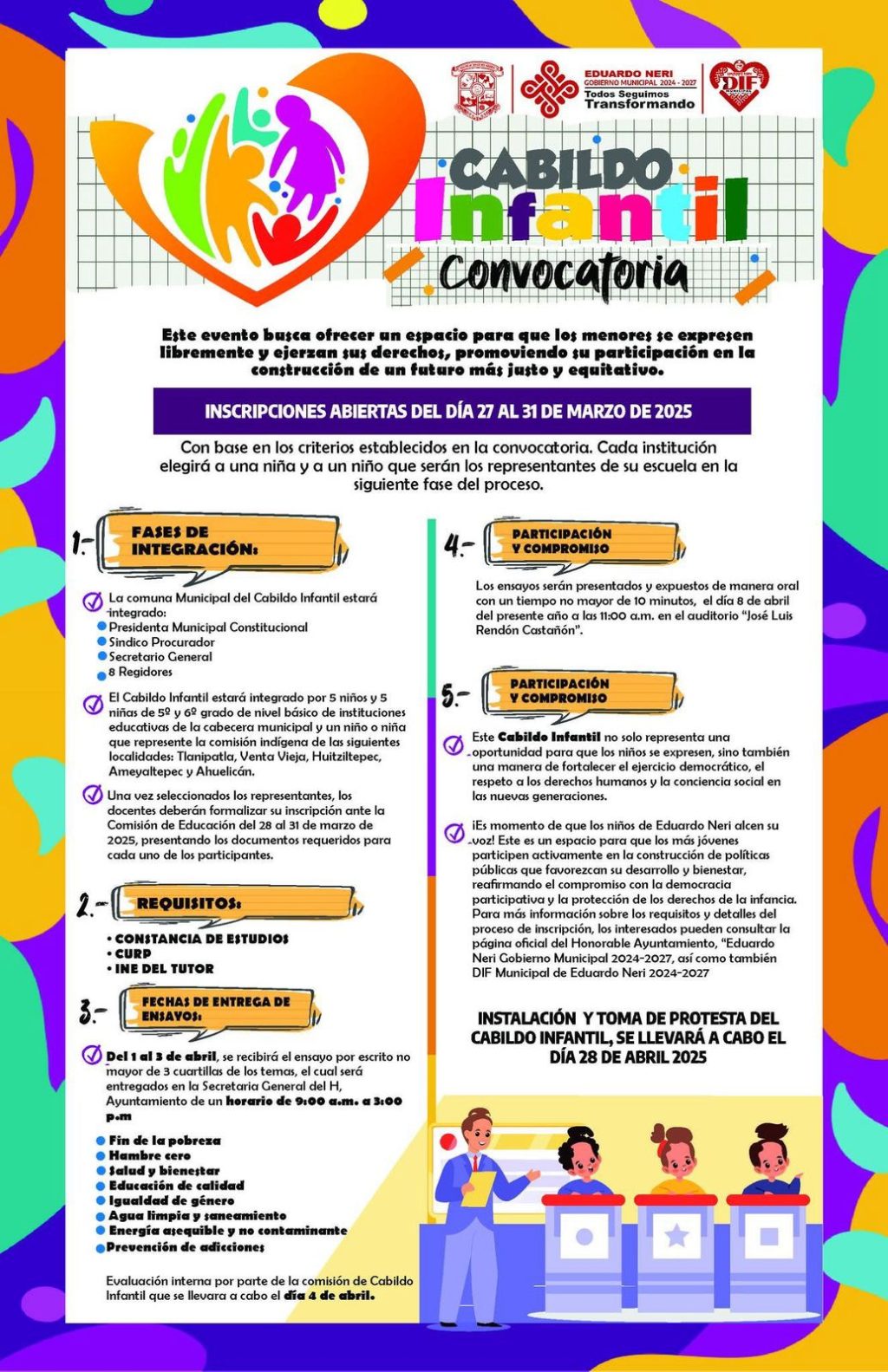 Niños y Niñas para participar en el Cabildo Infantil 2025, podrán sumarse a este ejercicio de participación ciudadana alumnos de quinto y sexto grado de nivel primaria, donde podrán representar a todos niñas y niños en el H. Ayuntamiento de Eduardo Neri.