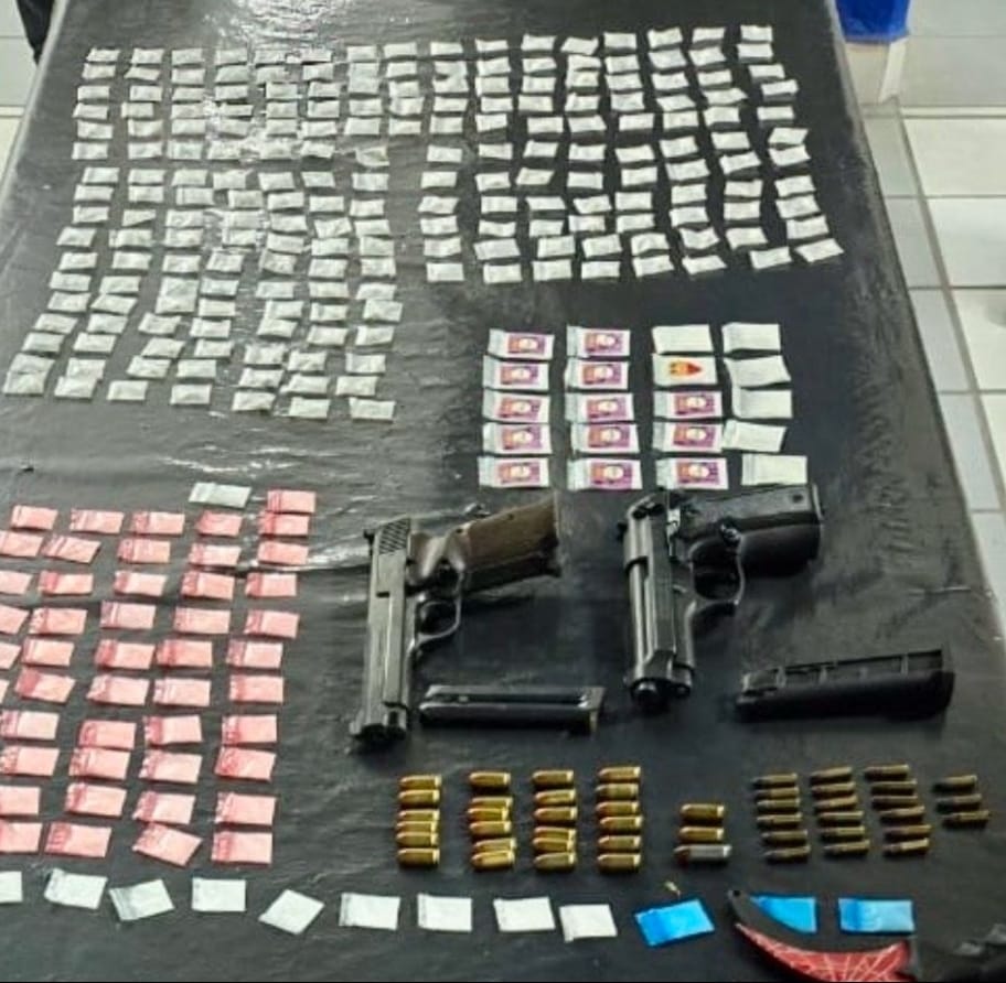 Durante la intervención, el personal de las instituciones participantes detectó a los ahora detenidos en posesión de diversas sustancias ilícitas y armamento. Al ser asegurados, les fueron localizados los siguientes indicios: