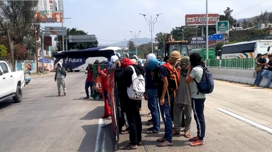 Desde las 10:00 horas del martes, al menos 40 normalistas con el rostro cubierto llegaron al lugar en dos autobuses, con los que bloquearon un carril en ambos sentidos de la vía federal, en la salida sur de Chilpancingo.