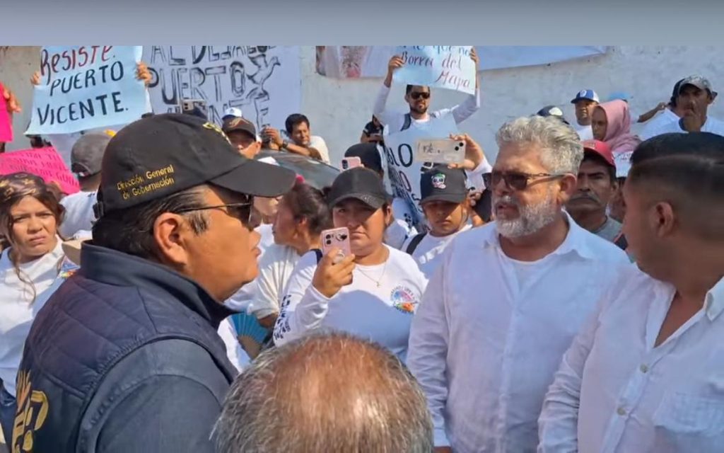 Acapulco Gro., 10 de mayo del año 2025.- Durante la visita de la presidenta de México, Claudia Sheinbaum Pardo al puerto de Acapulco pobladores y restauranteros de Puerto Vicente Guerrero, localidad del municipio de Tecpan de Galeana, se manifestaron para evitar el desalojo de sus viviendas y negocios, ya que están asentados en zona federal reclamada por la Secretaría de Marina