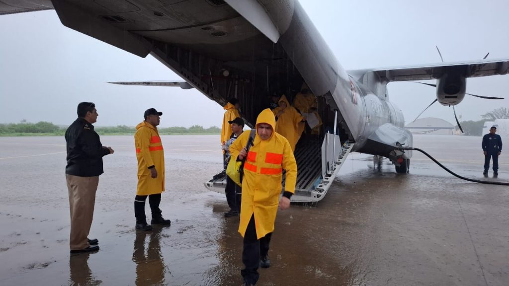 elementos de la secretaria de Marina Armada de México bajan de un avión oficial, luego de que hoy jueves el Huracán Erick amenaza con azotar las costas del Estado de Guerrero, dios libre a Acapulco y otras zonas de sufrir desgracias.