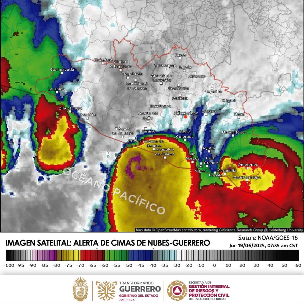 Chilpancingo, Gro., 20 de junio de 2025.– La madrugada de este jueves, a las 05:30 horas, el huracán Erick impactó tierra como categoría 3 en las inmediaciones de Santiago Pinotepa Nacional, Oaxaca, provocando intensas lluvias y condiciones de riesgo en regiones del sur del país.