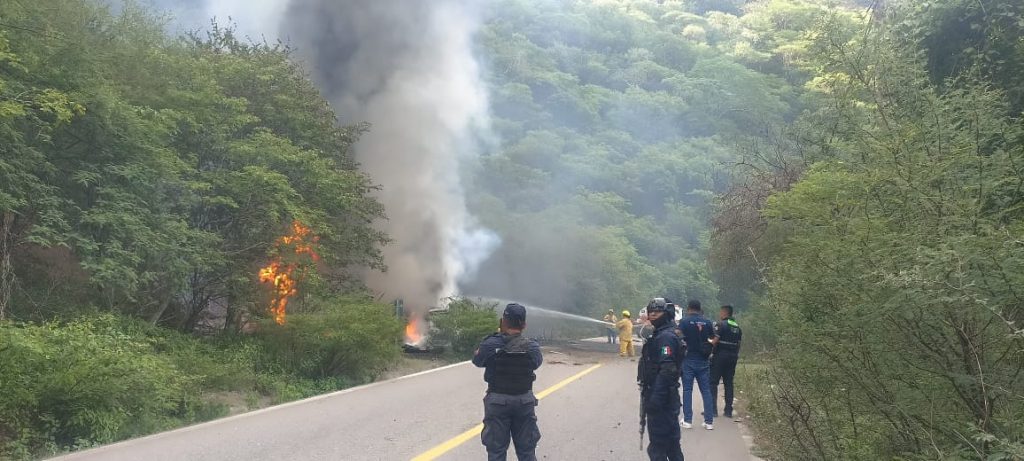 Elementos de Tránsito y Policía Estatal brindan apoyo vial en la carretera Chilpancingo-Puebla, a la altura del crucero de Otate-Tlalixtaquilla, en el municipio de Tlapa de Comonfort, donde se registra la volcadura e incendio de un camión cisterna.