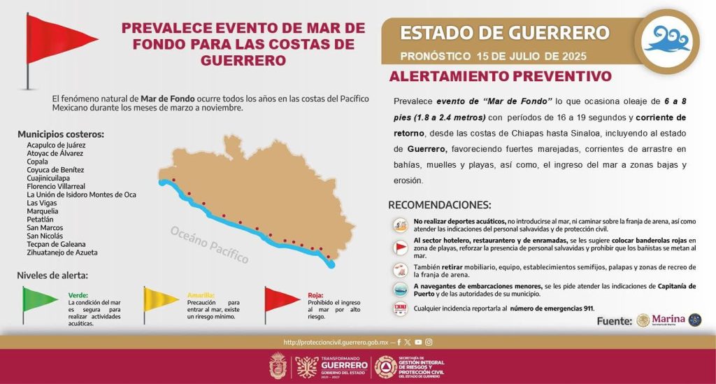 Se mantiene el evento de Mar de Fondo en el litoral del Pacífico mexicano, con oleaje elevado de 1.8 a 2.4 metros (6 a 8 pies) y periodos de 16 a 19 segundos, desde Chiapas hasta Sinaloa, incluyendo las costas de Guerrero.