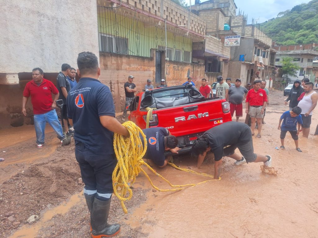 El incidente ocurrió a la altura del puente peatonal de la comunidad, donde la creciente impidió que las unidades pudieran avanzar. Elementos de Protección Civil realizan maniobras para liberar los vehículos y garantizar la seguridad de los conductores y pasajeros.