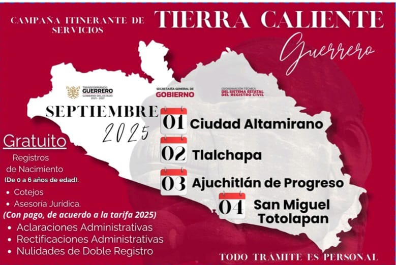 Chilpancingo, Gro., 02 de septiembre de 2025.- Para acercar los servicios a la población y garantizar el derecho a la identidad, por instrucciones de la gobernadora Evelyn Salgado Pineda, la Coordinación Técnica del Sistema Estatal del Registro Civil, inició la Campaña Itinerante de Servicios en la región de Tierra Caliente.