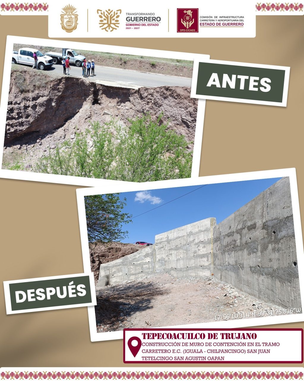 Por instrucciones de la gobernadora Evelyn Salgado Pineda, la Comisión de Infraestructura Carretera y Aeroportuaria del Estado de Guerrero (CICAEG), llevó a cabo con una inversión superior a 1 millón 200 mil pesos, los trabajos de construcción del muro, a fin de evitar que el socavón provocara la interrupción de la circulación en esa importante vía de comunicación.