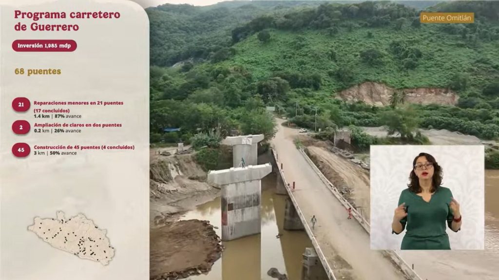El secretario de Infraestructura, Comunicaciones y Transportes, Jesús Antonio Esteva Medina, informó desde la conferencia matutina de la presidenta Claudia Sheinbaum Pardo, que el Programa Carretero de Guerrero contempla 68 obras en puentes con una inversión total de 1,985 millones de pesos, entre trabajos de reparación, ampliación y construcción, con avances significativos en todo el estado.